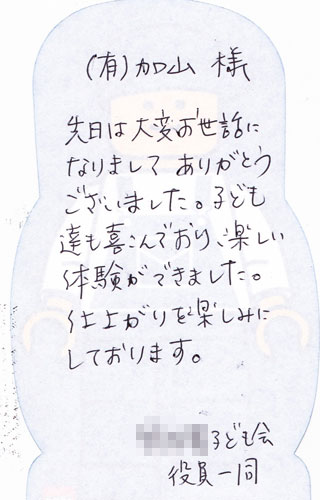 楽しい体験をさせていただきありがとうございました。メールにて失礼いたします。
